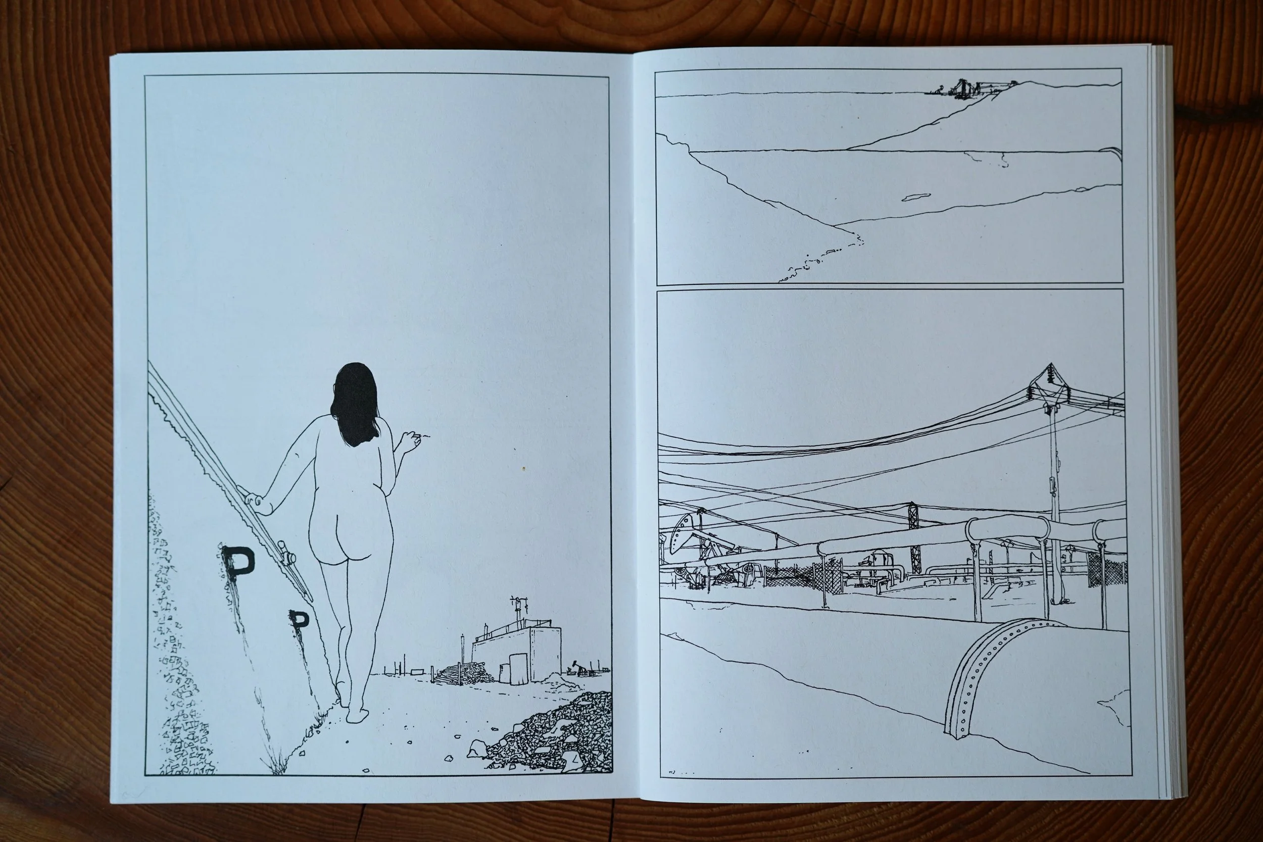 Sikorski’s first self-published book, Oil Field, is a nearly-silent comic following a woman as she wanders through an oil field. Her meandering daydream is punctuated by some high-stakes moments as she recklessly explores the landscape she finds herself in. Oil Field is filled with mechanical and somatic details, expanding fleeting moments into a slow meditation.